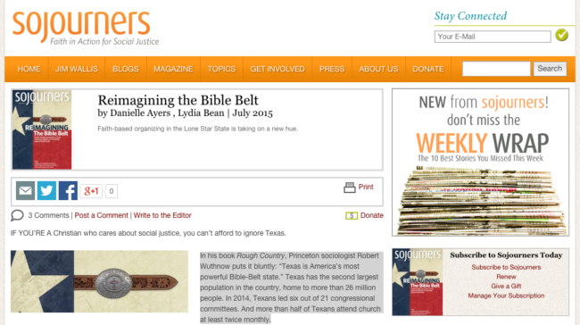 IF YOU’RE A Christian who cares about social justice, you can’t afford to ignore Texas. In his book Rough Country, Princeton sociologist Robert Wuthnow puts it bluntly: “Texas is America’s most powerful Bible-Belt state.” Texas has the second largest population in the country, home to more than 26 million people. In 2014, Texans led six…