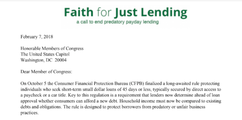 Mar262018FeaturedHomeNewsFebruary 7, 2018 Read the statement from Faith for Just lending sponsors here. Categories: Featured, Home, NewsBy lendjustlyadminMar 26, 2018 Author: lendjustlyadmin Post navigationPreviousPrevious post:Faith for Just Lending Coalition urges CFPB to strengthen proposed payday ruleNextNext post:CFPB Moves to Weaken Payday Lending RegulationsRelated PostsFaith Leaders and Veteran Advocates Urge Congress to Establish a National Loan Rate Cap by Passing the Veterans and Consumers Fair Credit ActNov 30, 2021Faith Leaders Applaud the U.S. Congress for Voting to Overturn OCC’s Harmful Rule Enabling Predatory LendingJun 29, 2021Faith for Just Lending Asks Congress to Support the Veterans and Consumers Fair Credit ActMay 25, 2021PRESS RELEASE: Faith Leaders Applaud the U.S. Senate for Voting to Overturn OCC’s Harmful Rule Enabling Predatory LendingMay 25, 2021Faith Leaders Applaud Congress’ Decision to Challenge OCC’s ‘True Lender’ RuleMar 30, 2021Faith Leaders Call on Congress to Protect Borrowers in COVID-19 Relief LegislationJul 31, 2020