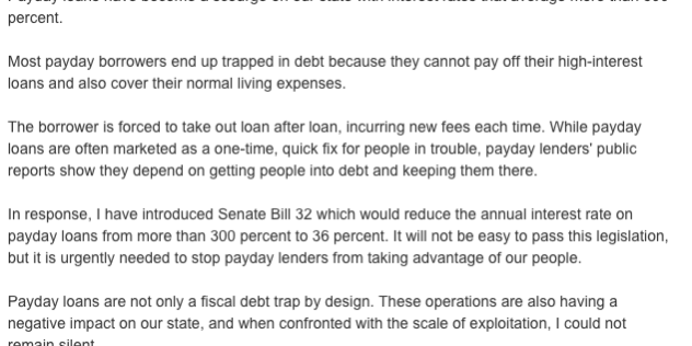 Payday loans have become a scourge on our state with interest rates that average more than 300 percent.