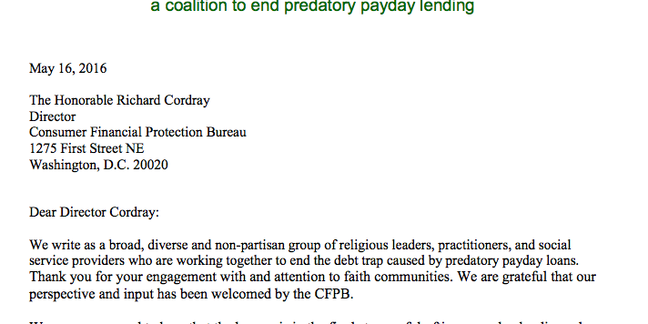 Faith for Just Lending sponsors express thanks, concerns and hopes to the Consumer Financial Protection Bureau Director, Richard Cordray as the CFPB nears its final stages of drafting a payday lending rule.